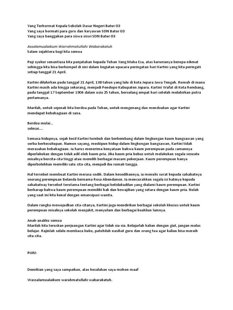 Berkat perjuangannya, wanita dapat mengenyam pendidikan di sekolah. pidato memperingati hari kartini apakah anda saat ini sedang mencari referensi dan teks pidato pada acara memperingati hari kartini. Misalnya, jika pidato ketika acara peringatan hari kartini maka isi dari pidato yang disampaikan adalah tentang hal yang berkaitan dengan hari kartini. Contoh pidato memperingati hari kartini contoh soal dan materi pelajaran 3. hari kartini merupakan hari yang diperingati tepat saat hari kelahiran raden ajeng kartini yaitu setiap tanggal 21 april tiap tahunnya, yang dimulai sejak tahun 1964 oleh semua rakyat indonesia, memperingati hari kartini bertujuan memperingati dan menghormati perjuangan raden ajeng kartini untuk mewujudkan keseimbangan derajat antar pria maupun.